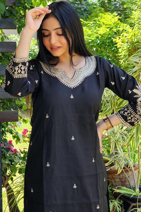Black Women Embroidered Straight Kurta Pants Set with Dupatta