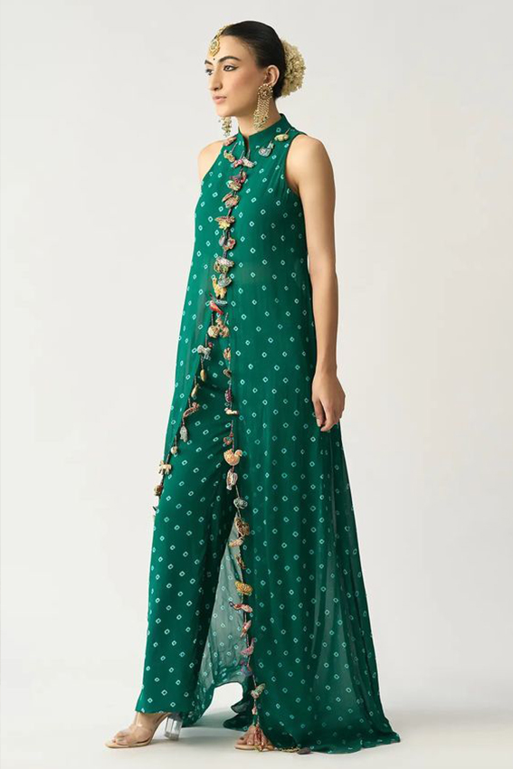 The set comes with block print kurta has v neck 3/4th sleeves and calf length teamed with printed trouser pant and a printed chanderi cotton dupatta to match.