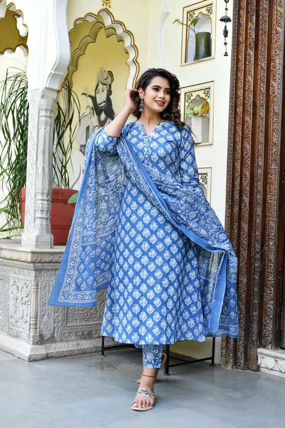 The set comes with block print kurta has v neck 3/4th sleeves and calf length teamed with printed trouser pant and a printed chanderi cotton dupatta to match.