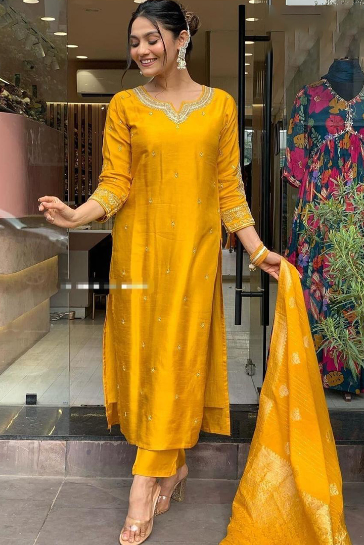 Elevate your ethnic wardrobe with this elegant viscose chanderi kurta set. Featuring intricate embroidery on the top, paired with a plain bottom, and complemented by a jacquard dupatta, it’s perfect for weddings and special occasions. Embrace timeless tradition with modern flair.